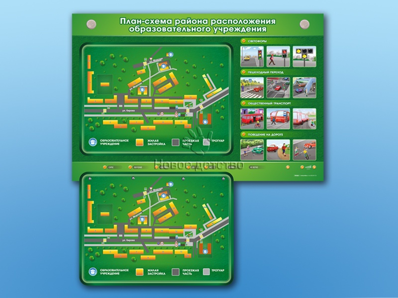На маркерное поле накладывается фолия с соответствующей картой района, на которой цветными маркерами можно проложить путь от школы до интересующего объекта. Маркерная поверхность лицевой панели стенда позволяет по памяти рисовать различные схемы и маршруты для отработки практических навыков. Фолия крепится в верхней части стенда при помощи специальных элементов, установленных на панели. В комплект поставки входят цветные маркеры.