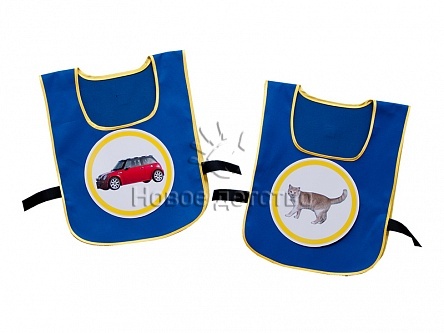 Игровой набор представляет собой комплект из ярких сине-желтых жилетов, надевающихся через голову, и круглых цветных тематических картинок.