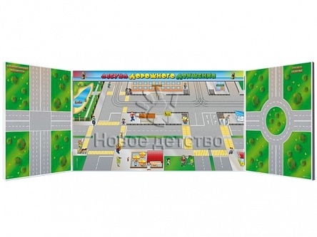 Панорамная трехэлементная комбинированная магнитно-маркерная доска представляет собой информационную панель, на которой изображена демонстрационная схема дорожного движения участка города, включая проезжую часть, трамвайные пути, перекрестки, пешеходные переходы, остановочные площадки, объекты социальной инфраструктуры, для моделирования дорожных ситуаций с помощью магнитов и цветных маркеров.
