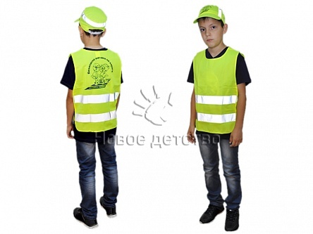 Световозвращающий жилет-накидка представляет собой одежду без рукавов желтого цвета с двумя световозвращающими полосками. На спине жилета нанесены рисунок и слоган. По бокам расположены эластичные ленты черного цвета, которые позволяют варьировать жилет по размеру для детей разного возраста и телосложения.